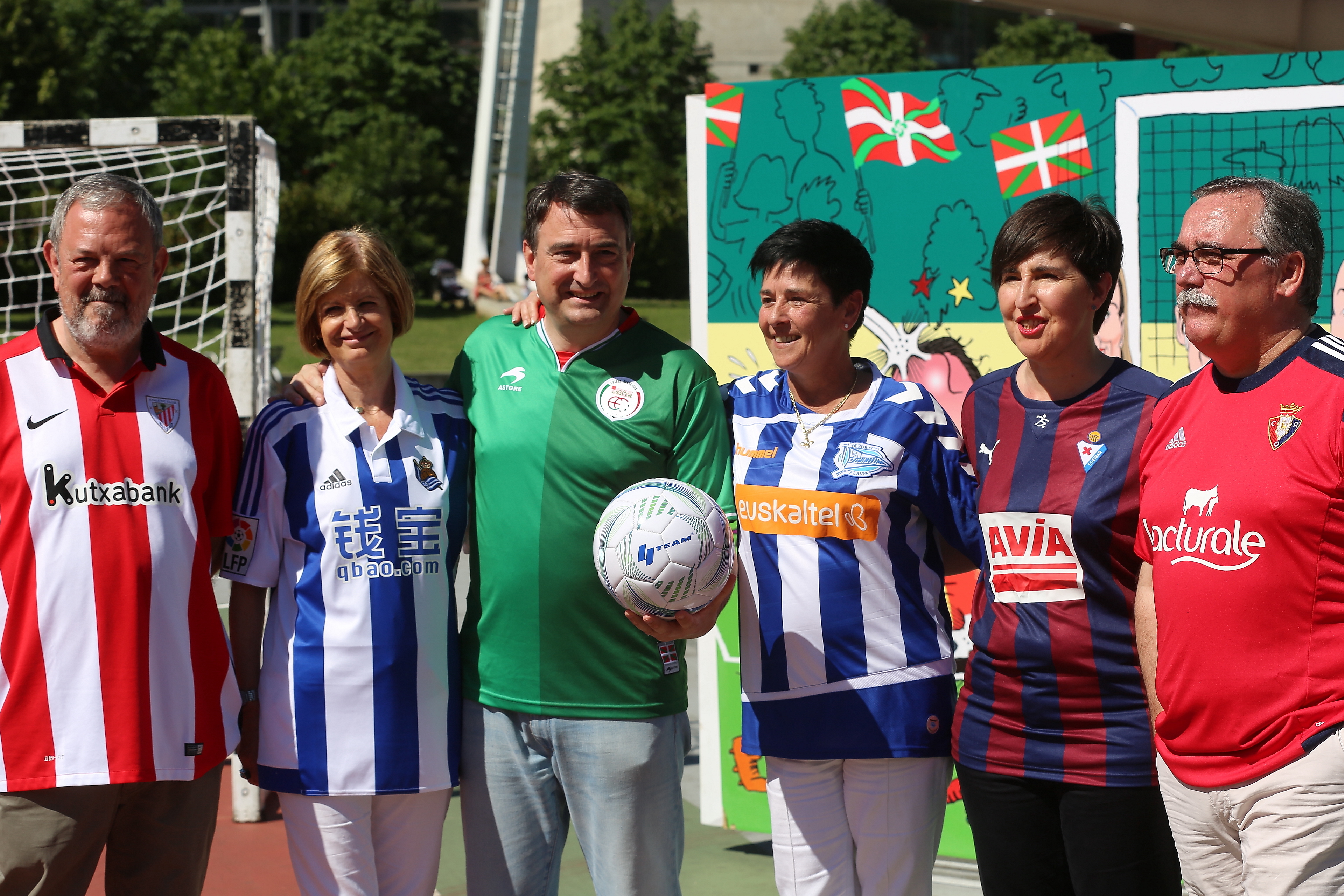Aitor Esteban ha hecho estas reivindicaciones acompañado por Pedro Azpiazu y Pilar Ardanza, candidato y candidata al Congreso por, y José María Cazalis, Nerea Ahedo y María Dolores Etxano, candidato y candidatas al Senado, quienes portaban las camisetas oficiales de los cinco equipos vascos que jugarán la próxima edición de la liga. “Aquí detrás están mis compañeros, cada uno con una camiseta diferente, pero con el color verde en el corazón”, ha apuntado (refiriéndose a la camiseta de la selección de Euskadi que él vestía). Con una portería a sus espaldas, el candidato ha señalado que “así es como nos sentimos muchas veces en Madrid, intentando parar los balonazos que nos intentan meter y nos lanzan contra el autogobierno. Pero, estad seguros que a la más mínima ocasión les vamos a meter un gol por la escuadra en esta materia. Todos juntos: sociedad, deportistas, desde la política… empujando todos por este objetivo”, ha avanzado.